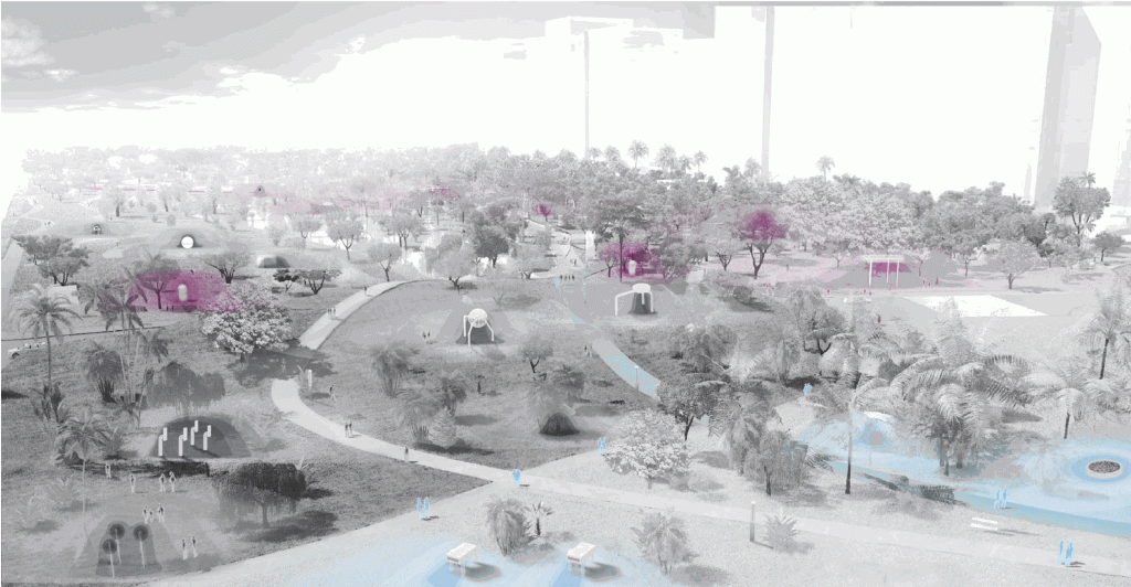 While the design does not explicitly focus on scent, the modulation of humidity and air quality indirectly influences the park’s olfactory environment. For instance, drier areas may accentuate the natural aromas of vegetation, while cleaner air zones enhance the perception of floral and plant-based scents. The integration of native plant species further contributes to the park’s evolving scent profile, offering visitors a subtle yet immersive sensory experience.